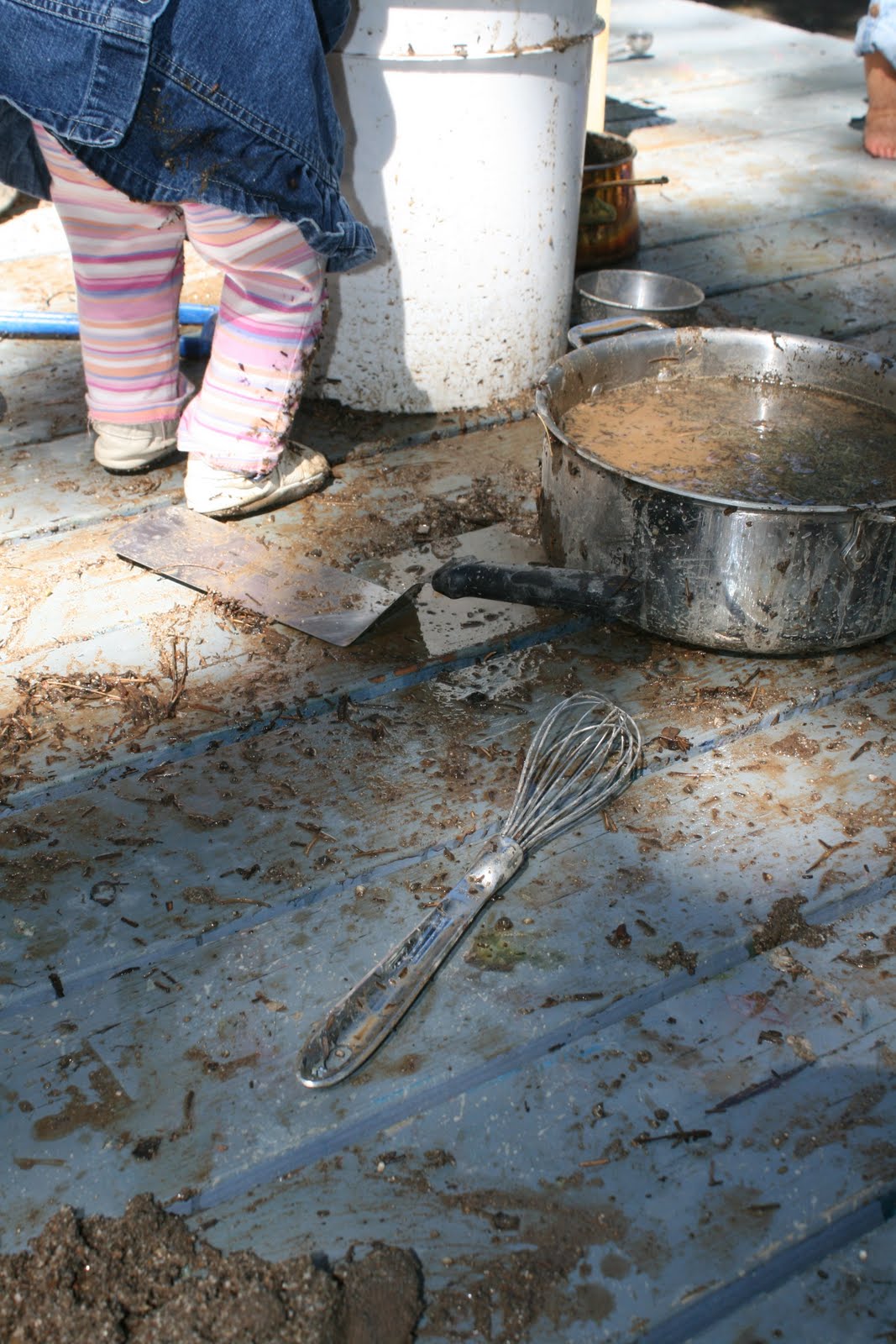 The children fixed up a culinary delight today with dirt, sand, and water. We used many pots and pans with different kitchen tools to make our concoctions. The children mixed just the right amount of dirt, sand, and water to create their mud pies and stone soup! They had fun using all the different kitchen tools to create their masterpieces. Spencer had fun pinching his tongs into the dirt to move into his bowls. Ben wore the tongs around his neck for awhile! Scoops were use to mix the right amount of dirt. Even Maya joined in on our feast as she helped pour dirt and sand into various bowls. It sounded like a symphony as metal bowls and spoons clanked together. Wyatt and Caleb stepped into some small bowls with their feet and skated around the deck. Cade and Toben created little "sand castles" as they emptied the wet mass pressed into small bowls onto the deck. Cedar, Avery, and Meadow explored dumping and filling the muddy water into all the bowls creating an array of wonderful soups! Meadow and Cedar played peekaboo with each other between the slider door with many smiles! Everyone enjoyed our activity today. Hooray for Mud!