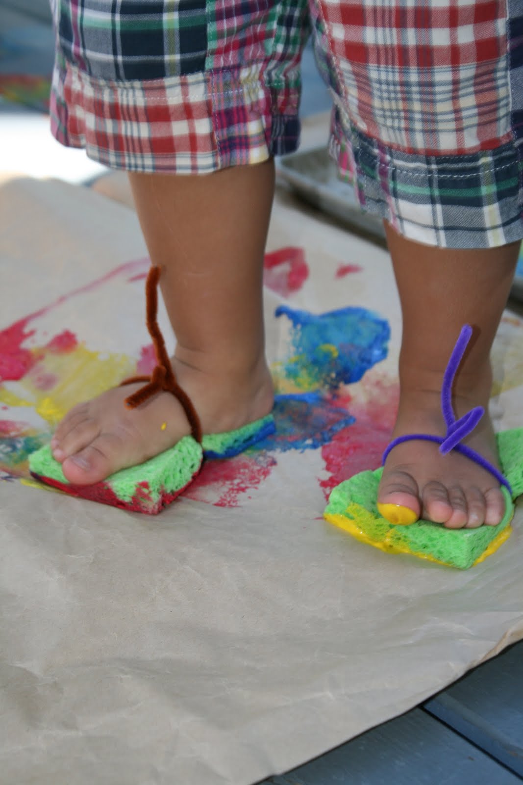 The children had fun marching to the beat as they stomped across our paper with their sponge shoes on! We created sponge stamp shoes made out of sponges and pipe cleaners. The children loved stomping their feet into the different colored paint on our baking sheet pans. Then they would run, stomp, hop, dance...across our long paper. The children had fun working together as a group in this activity producing a beautiful work of sponge art on the paper. Then the children decided to take off their "shoes" and squish their feet in the paint running and stomping across the paper. Rainbow feet danced across the papers with smiles and giggles! Sponges were used to clean the deck and feet as our activity came to an end. Soap and water were brought out in our sensory bins as a whole new activity arose as clothes came off and went flying everywhere! The fun began all over again as they washed their feet and bodies until all the paint disappeared. What a fun group activity and sensory explosion for our feet today!