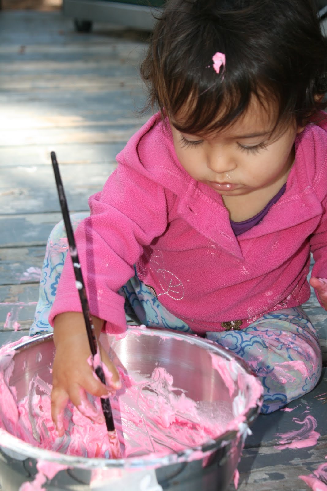 The children explored painting with a rainbow of shaving cream today. We mixed shaving cream with paint and glue to make our medium. I had the intentions of having the children sprinkle glitter on their papers but we ended up enjoying the sensory aspect of our project too much to care about glitter! The children used various brushes to paint on their papers with our puffy paint. Then they painted faces...then hands...arms...then feet! They enjoyed stepping in the bowls and getting their toes in the squishy paint. Then they slid with their feet on the deck from the slippery paint. We always have a fun day when we play with shaving cream!