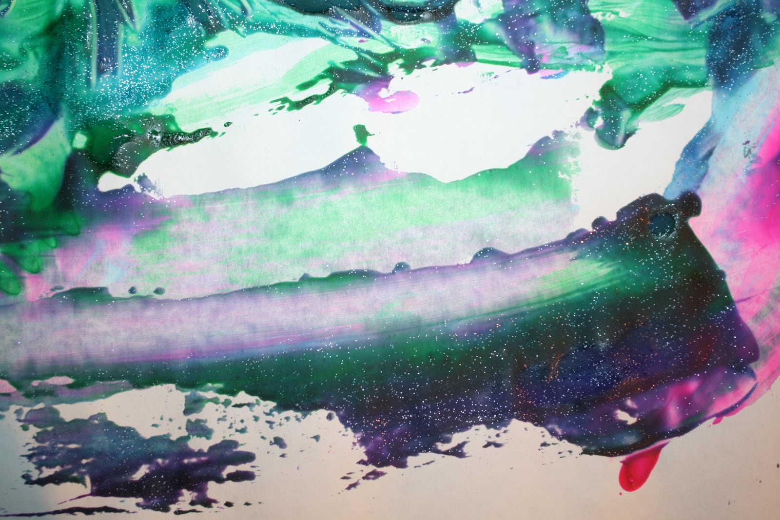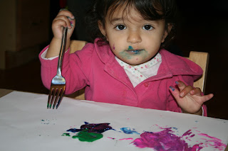 Today we used our forks to make beautiful pieces of art! The children loved exploring with their forks moving the paint around and mixing the colors. We gave the children green, pink, and sparkly blue paints. The children really like smearing the paint with the backside of their forks making the different colors smear on their papers spreading the paint in beautiful rainbows and designs. Some of the children explored poking their forks into the paint to make dots on their papers. Others would drag the fork leaving track marks. What a fun way to use forks for a painting tool!